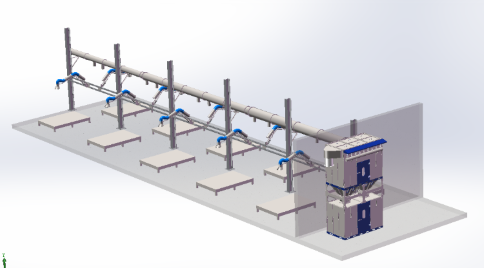 在涂裝生產線現場分散布置有5套廢溶劑收集裝置,1套分布于中涂線(包括8臺機器人和10個手工噴漆點),2套分布于面漆色漆線(包括8臺機器人和16個手工噴漆點)