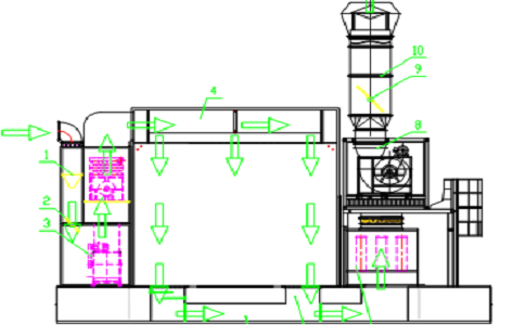 高壓電柜噴粉烘干固化自動生產(chǎn)線隔離室 1.設(shè)計原理 為了減少噴粉車間不受到外界的污染、工件在生產(chǎn)線上的再次污染、提高成品率,在噴粉車間外設(shè)計一隔離室,防止車間內(nèi)灰塵的再次污染,補(bǔ)風(fēng)采用頂部經(jīng)初效過濾自然進(jìn)風(fēng)。