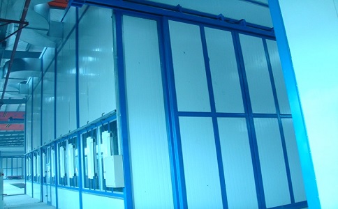 水漩噴漆室送風系統送風系統主要由送風機、風機座、支架和風管等部分組成。噴漆室采用上送下吸的氣流組織方式,送風裝置采用分組送風的方式,由新風段、初效段、加熱段、風機段等組成,設備運行平穩、可靠。新風段從廠房側面吸進新風,送風均勻,工件兩側工作區域內層流風速最大誤差在±0.1m/s以內。