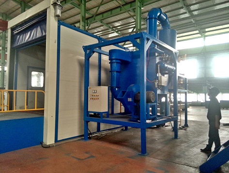 砂料儲(chǔ)存在噴砂主機(jī)的噴砂罐內(nèi),當(dāng)進(jìn)行噴砂作業(yè)時(shí),噴砂罐上的組合閥動(dòng)作,將噴砂罐上的封砂托頂起、噴砂罐充壓;同時(shí),噴砂罐下面的砂閥打開、助推閥打開;由于噴砂罐充壓,強(qiáng)行將砂料從砂閥的進(jìn)砂口壓出到出砂口,通過助推氣流,將砂閥出砂口的砂料加速;加速后的砂料氣流混合流通過噴砂管至高速噴砂槍并在高速噴砂槍內(nèi),進(jìn)一步將砂料加速(助推氣流加速至超音速);被加速的砂料以很高的速度噴射到被處理工件的表面,實(shí)現(xiàn)噴砂作業(yè)的表面清理及強(qiáng)化目的。 | 刮板真空回收噴砂房室內(nèi)的磨料通過格柵板直接落到刮板機(jī),刮板機(jī)把室內(nèi)的磨料及粉塵混合物輸送至端頭的蜂窩漏斗進(jìn)入真空回砂設(shè)備,通過真空回收設(shè)備的磨料回收水平管和立管吸入真空裝置,然后送入磨料分離系統(tǒng)中,通過磨料分離器、將磨料及粉塵及異物分離,有用的砂料進(jìn)入噴砂罐內(nèi)繼續(xù)循環(huán)使用,粉塵及異物則隨氣流進(jìn)入除塵系統(tǒng)內(nèi),經(jīng)過除塵系統(tǒng)的處理后排入大氣,粉塵及異物則儲(chǔ)存在粉塵筒中定期清理。 |