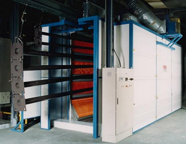 在烤爐進口安裝一套工件感應裝置,常規工件通過時,紅外輻射開啟約50%功率即可達到升溫要求,若有非常規工件(即尺寸過小),離輻射面板過遠時,感應裝置可提前發出信號,工件到達指定工位前,提前增加輻射面板輸出功率,配合爐內耐溫紅外線測溫儀,檢測表面油漆溫度,自動調節面板的輸出功率,可確保工件表面油漆溫度80°C±5°C的要求 | 在送風口設置過濾裝置,以保證循環風的潔凈度,選擇3001GG耐高溫粗效平板式過濾器,其采用無堿玻璃纖維絲條加工而成,纖維層由迎風面到背風面由稀到密,有效地阻攔灰塵,具有風量大、阻力小、阻燃、耐化學腐蝕、耐輻射能力卓越的特點。 | 為降低系統運行時能量的散失,在工件進出仿形門洞處,設置有風幕,利用高速氣流切斷熱量外流。 | 烘干溫度最高到200℃,可根據需要調節設定,以適應涂裝生產發展及采用不同涂料的需要。爐內溫度采用數字式溫控儀顯示并自動控制,在烘干室前、中、后三處各設一點,其中中間一點控溫,前后兩點顯示,在加熱室設一溫度顯示,采集信號送入控制柜溫控儀,由溫控儀按設定烘干溫度值對加熱器的工作進行自動控制,保證室體內溫度滿足烘干任務的完成。具有超溫聲光報警并自動聯鎖停機功能。 | 加熱系統設置有風壓開關,當檢測到無風送入時,立即發出控制信號,切斷加熱器,停止運行,避免“干燒”事故的發生。 |
