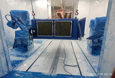 靜電噴粉房室體兩側設置人工補噴工位,工位大小及位置設置合理,根據機器人仿真噴涂軌跡,保證機器人噴涂不到的位置人工噴涂均能覆蓋,設計時要充分考慮鏈條速度與人工補噴速度的合理性,保證該工位設計滿足線體速度需求。同時該工位高度設置要合理,要覆蓋所有工件的人工補噴,并便于人工操作。