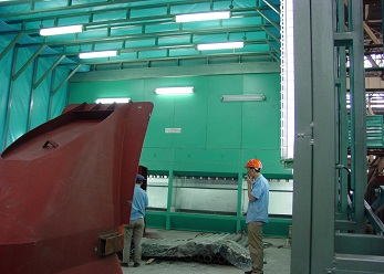 此噴涂線中工件輸送一般采用電動軌道車或天車為輸送方式。該噴涂線主要用于金屬工件、并且材質較厚、工件較大的設備、鋼板,如鑄鍛件、鋼結構件等。1噴1烘一般適合表面要求較低的設備(一般不建議采用),一般情況下,由于工件較大、重,生產量不高的情況下,噴砂(丸)、除塵都在噴砂房內處理。噴底漆、面漆、烘干都在噴烘一體房內進行。